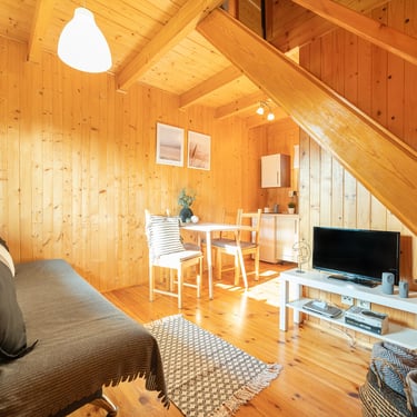 Salonik: TV LED, stolik tv, rozkładana kanapa/sofa, lampa do czytania, wieszak,