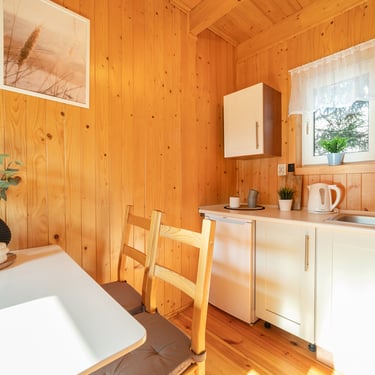 Kuchnia: lodówka, czajnik b/p, kuchenka indukcyjna, naczynia, sztućce, patelnia, garnek, rondel, akcesoria kuchenne itp., stół oraz cztery krzesła