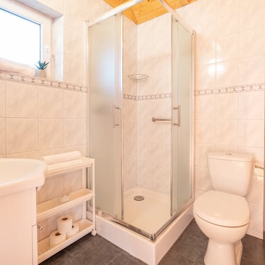 Łazienka: kabina prysznicowa, WC, suszarka do włosów, ręczniki kąpielowe