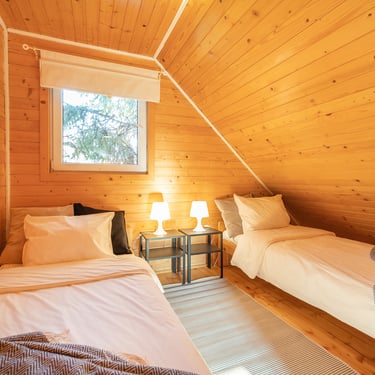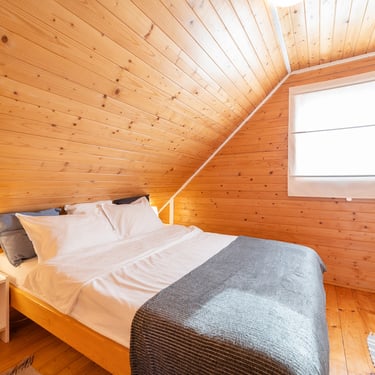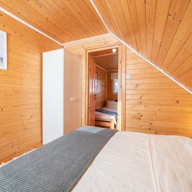 Dwie osobne sypialnie, w jednej łóżko małżeńskie, w drugiej dwa pojedyncze łóżka (4 miejsca noclegowe na piętrze), fotel, szafa, stoliki nocne, lampki nocne, komoda z 3 szufladami, schody zabezpieczone bramką